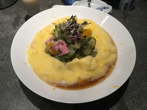 ここまでするか!ってな感じで冷やし麺求道者として確認かねて食ってきた! <食前酒> ハイビスカスソースの乗った冷やし甘酒 <全体> 想像以上にフローズン感覚溢れる麺顔に確かに汗が引く! <タレ> フルーツ感あるベースの酸味!加えて柑橘フレーバー…