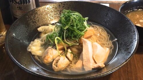 すっかり地元に溶け込む良店になってるねぇ〜 <酒> アサヒスーパードライ:汗掻いた後なら一番旨い液体がこれだ! <全体> 牡蛎2粒だけじゃない!まさに牡蛎三昧!色んな仕掛けが牡蠣なのだ! <浸しスープ> 非常に淡い牡蠣の出汁感!仄かに旨味で甘い…