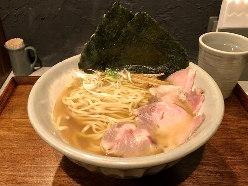 ついに出た!白醤油バージョン! くじら食堂bazar 三鷹店 (東京・JR三鷹) 白醤油ワンタン + 替玉 極細バリカタ麺 〜ラーメン食べて詠います <全体> いつも通りのかしわとワンタンの迫力!いつもより素材感キラキラ!白醤油のときめき! <スープ> 白…