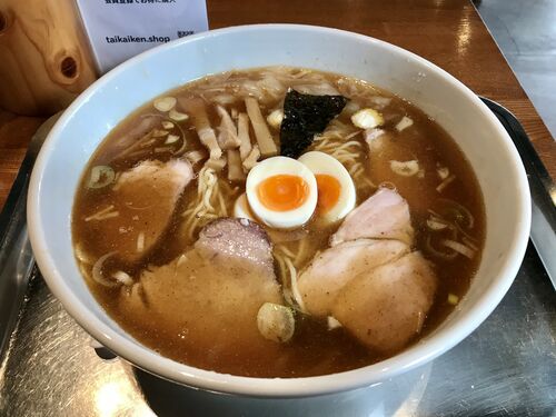 大勝軒じゃなく「大海軒」・・・永福町の系譜を求めて八王子 中華そば 大海軒 八王子店 (東京・八王子) 玉子入りチャーシューワンタン麺 〜ラーメン食べて詠います <全体> 銀のトレーと洗面器サイズの大丼!煮干しとラードの香りが湯気に混じる!嗚呼永…
