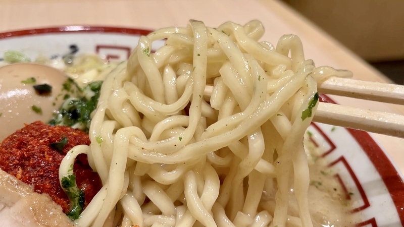 とっても優しい感覚。多少ボコボコしてて、素朴さを少し残し明るい食感。密度感よりもライトな歯応えが鮮やかで、芯がほとんどない仕上がりです。風合いよりも出汁を吸い込んだ旨味に特化したタイプで、箸でリフトすると絡みあうがまとまりが薄い。だからスープの持ち上げは低め。