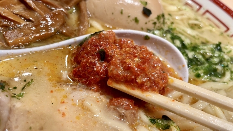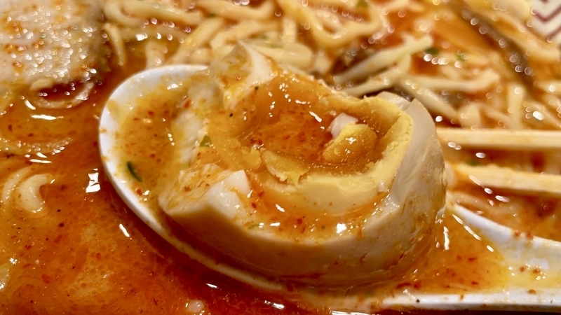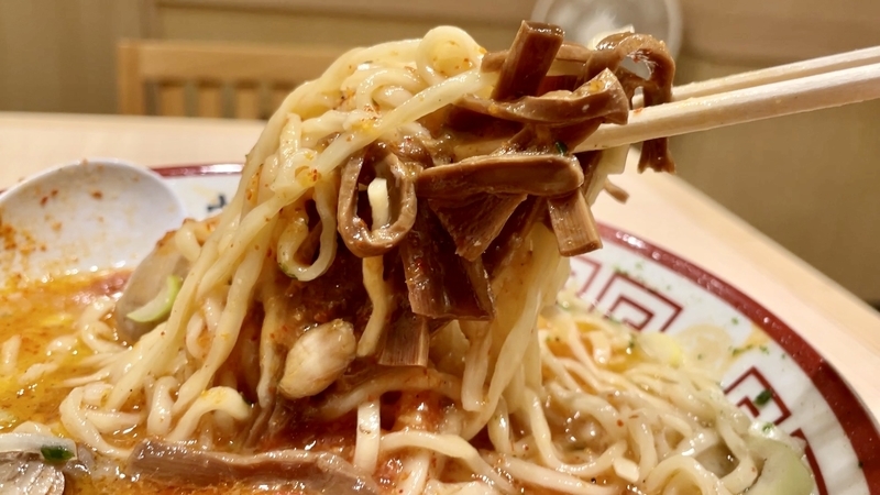 溶かしてからが面白い。分厚い甘味の出汁と、辛玉の刺激と一体化すると言うより、せめぎ合いとう感覚でしょうか。実際出汁と辛玉が完全に溶けずに分離状態で混ざるのですが、口の中でもそのような感覚です。良い悪いじゃなく、「辛味噌×らーめん」じゃなく「辛味×みそらーめん」なのだから、それでいいんじゃないでしょうか。