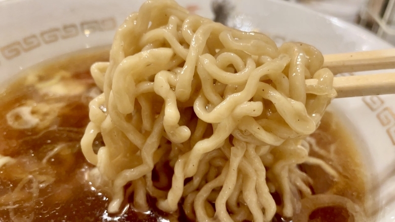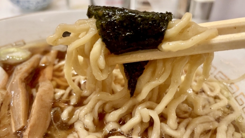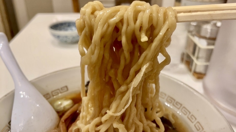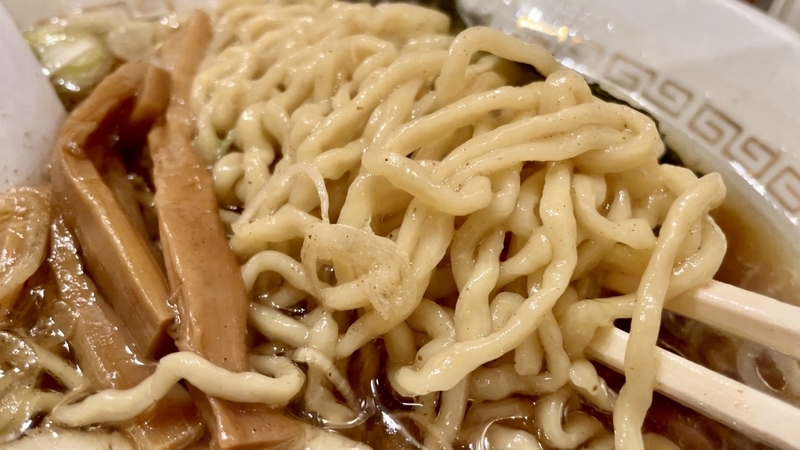 多加水の風合いですが、汁の吸い込みがよく、咀嚼して炭水化物とスープのエキスを一体化した旨味?いや甘味とすら感じる味わいが秀逸でございます。ズボっと啜りあげるのも快感で、舌触りや喉奥を軽くタッチして駆け抜ける麺の食い応えすら覚えます。啜りは素朴なシルエットと申せましょうか。