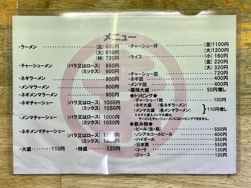 ちなみに酒類を注文すると、メンマか味ねぎが提供されますが、これもまた嬉しいサービス!。酒飲みの心が分かってる!。シチュエーションによって選んでくれます。例えば、メンマ皿を注文すると味ネギ、ネギ皿を注文するとメンマ、チャーシュー皿を注文すると???・・・答えは味ネギ!。チャーシュー皿には味ネギが入ってるのが理由でしょう。
