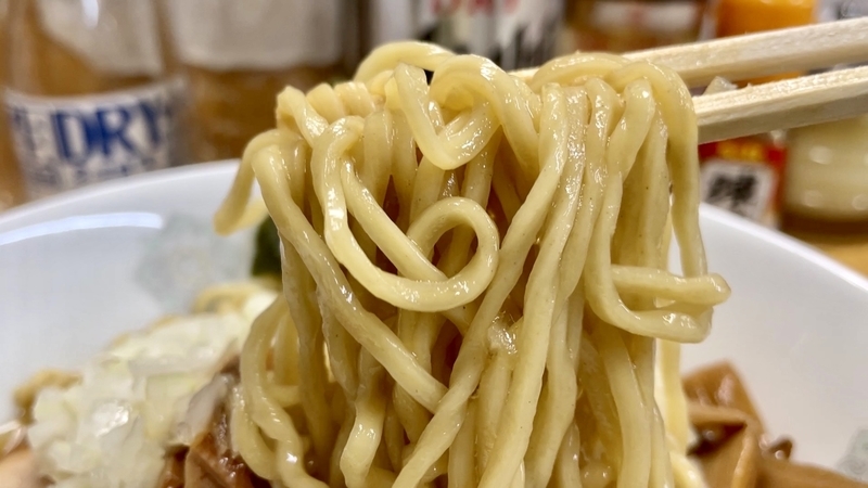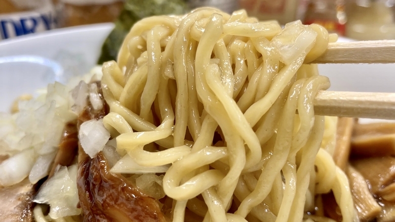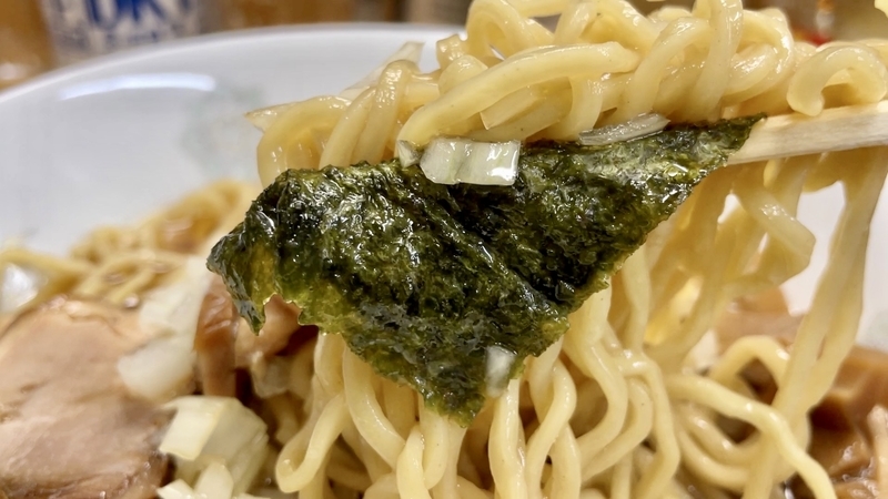 そこにしっかりめに魚介が浸透しております。甘味も穏やかなことから、煮干しよりも節系の溶け込みの方が、しっくりと感じるような味風景。鯖のような濃ゆさはないイメージかと。更にカエシも穏やかで、まさにゴクゴクと飲み干しても引っ掛かりがありません。薬味の玉葱もフレッシュな甘味を感じるほどで、飲んだ後の〆にもフィットしそうな味わいでしょう。