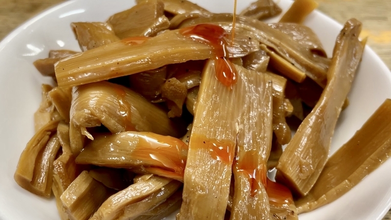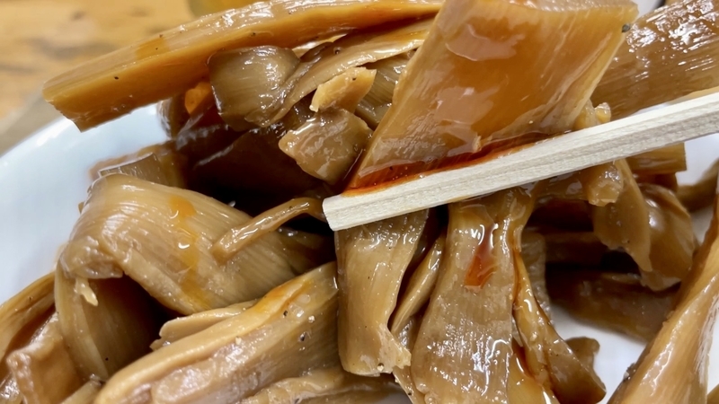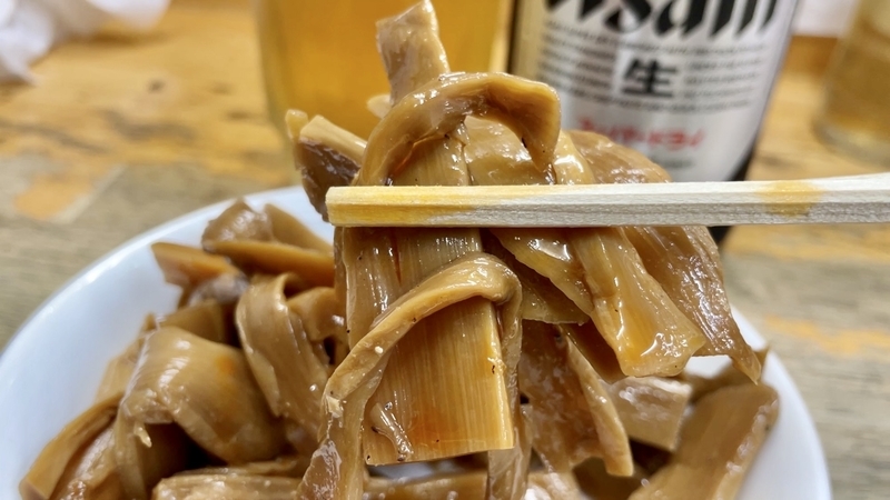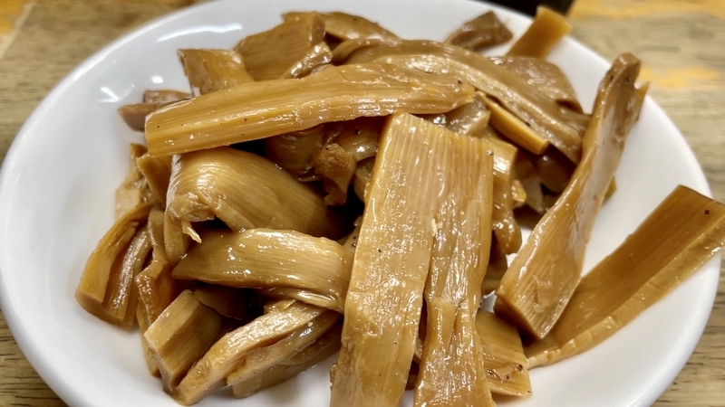 さてこのメンマ!醤油色がしっかりと染まった色合いで、その深さとは違い、塩気が低くて逆に甘味あるほどに円やか。そこに少し胡椒が効かせてあって、その仄かな刺激が妙に醤油と素材の風味に合うのだった!。いかにもなフニャコリとした歯切れの短冊タイプ。