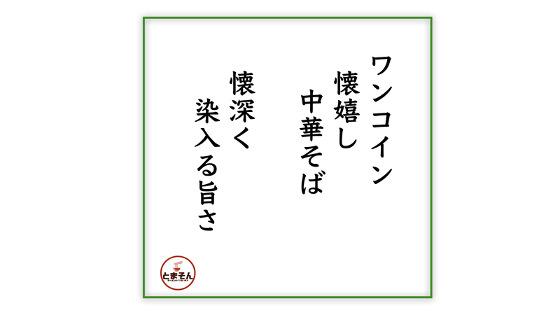 ・・・と言う感動の嵐!。たかがラーメンと言うこと勿れ。その一杯でオヤジ世代こそ心豊かに落ち着かせる旨さです。中華そばの原風景すら覚える旨さかと!。しかも若い世代がしっかり受け継ぎハートフルで入りやすい店です。なので懐かしさを味わいたくなったら激しくオススメ!旨し!なので・・・とっとと最後に詠って、いつものように締めたいと思います!。