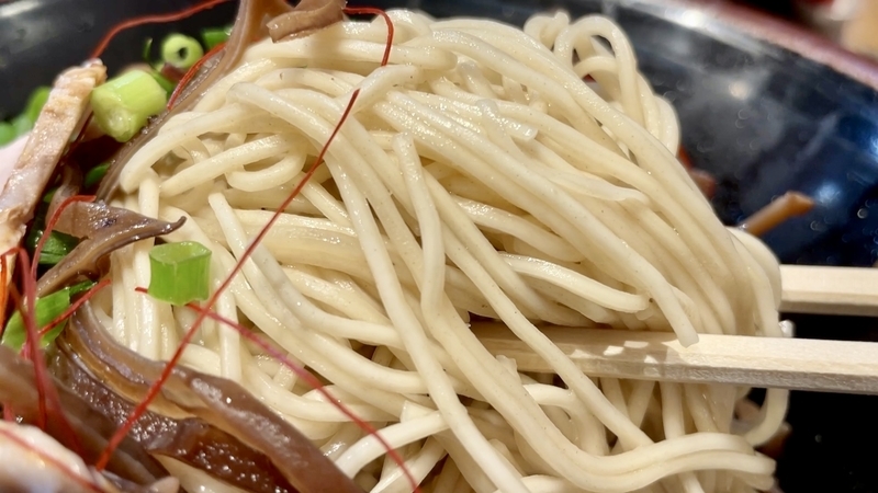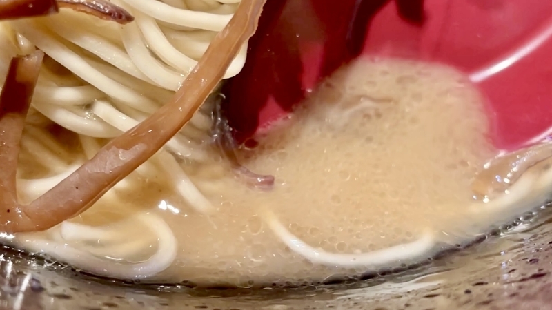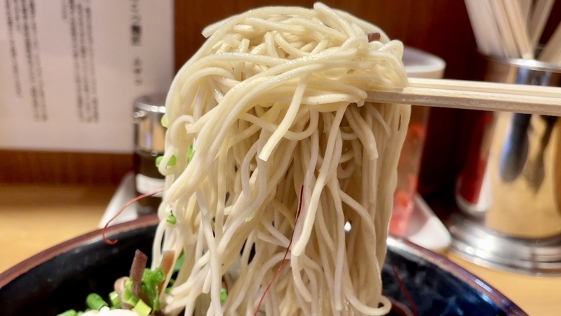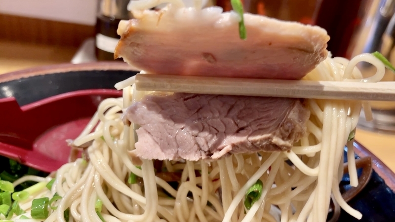 サラサラしてるのに、どこか全体的にぽったりとしているのが、こちらの豚骨スープの特徴。鶏ガラ&豚ゲンコツ&鶏モミジがよく溶けているようです。ポタポタとした感じは不思議と汁系で食らう時より少なめかも。