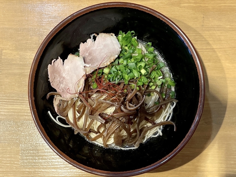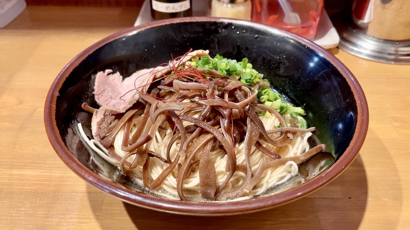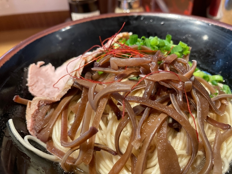 つまり上述の通りそんな感じ。残念ながら大盛対応不可ということだから、ちょっと少なく感じるけど、ちゃんとそれを見越してキクラゲと青ネギをプラスしてみた次第です。タレ系ではかく汁が少なめに浸ってる感覚。そこだけが替え玉とは違うところで、他はそのまま豚骨ラーメンてなプレゼンスですな。