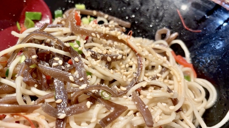性懲りもなく肉やきくらげ、更に青ねぎと絡めまくって堪能!それだけでなく薬味とも存分に絡めまくり。