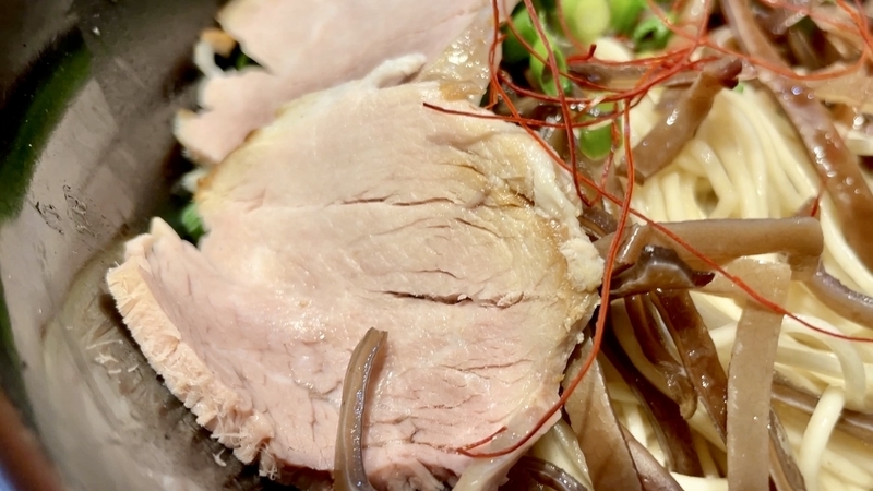 とってもしっとりした歯応えで柔らかいスポンジ感ある豚もも肉。出汁がサラサラしており、加えて野趣感が抑えめだから、妙に出汁との相性良いです。豚骨エキスを吸い込んでも肉本来の旨味がしっかり楽しめる。