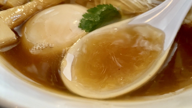 <スープ> 支える鶏出汁の芳醇さ!鯖節メインの円やかで分厚い旨さ!醤油感は優しい溶込み!