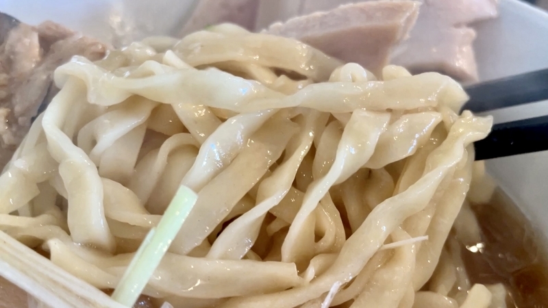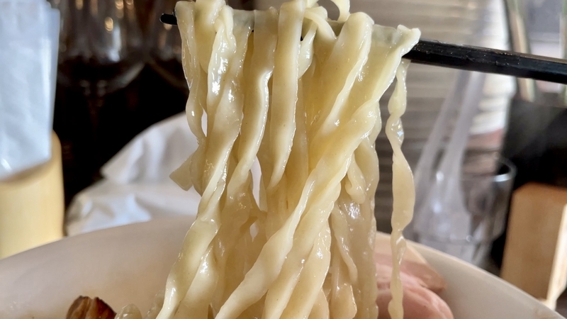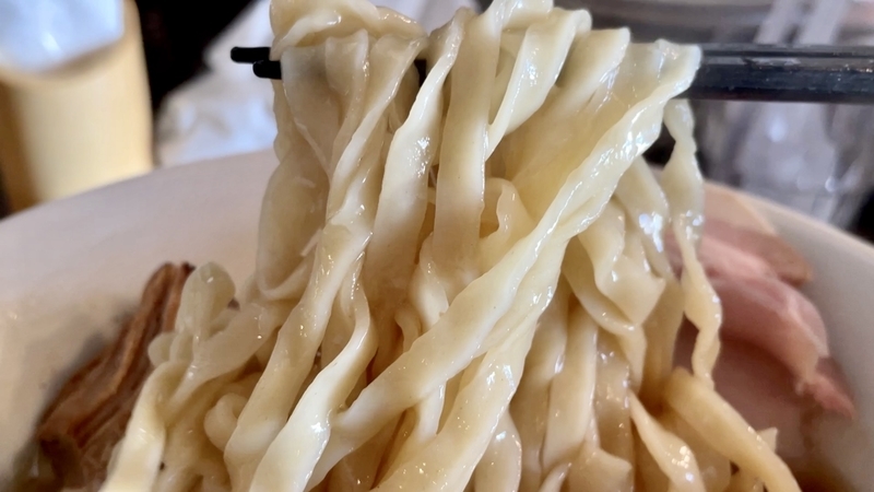 しばらく間隔を置きすぎて訪問してるのですが、来るたびに麺が変化してる感じ。今回は、手もみ風なチョイ多加水系の平型太麺です。馴染みすら覚えるしっかりとボコつくストレート細麺は、少し素朴にも感じます。