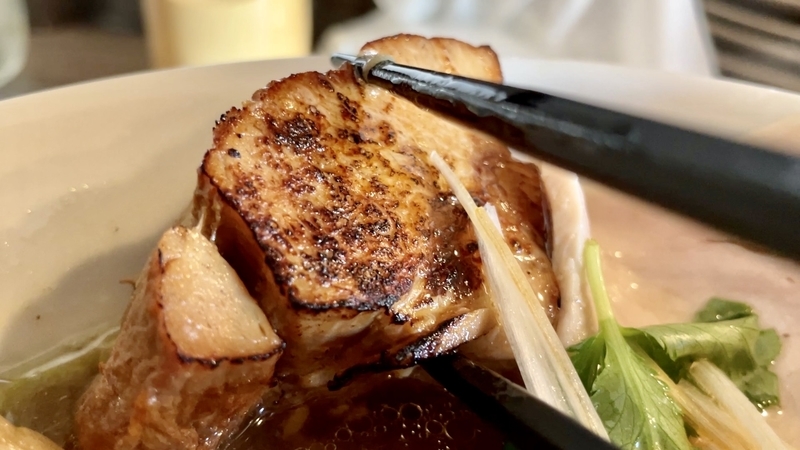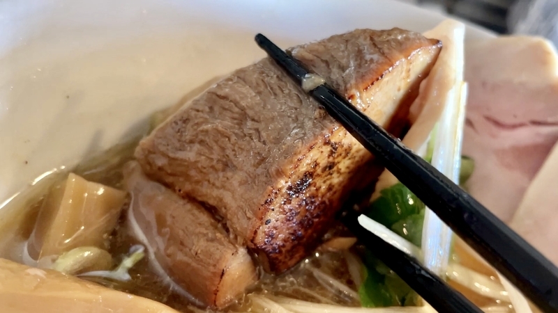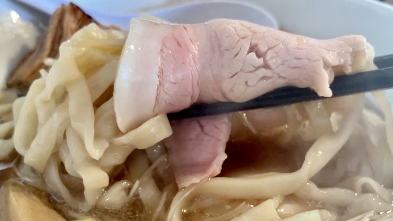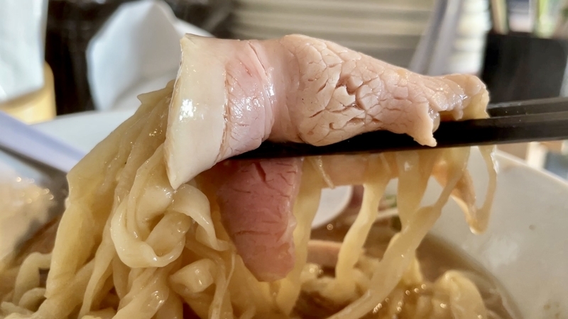そしてスライス肉は一転して上品!仄かに半レアのようなピンク色を残す肩ローススライスです。噛むほどに赤身の肉味と脂身の甘味、そして濡れた出汁味が染みて旨し!。これは麺に巻き込み挟みながら食らっても旨いし、酒にも合いそうな質感です。