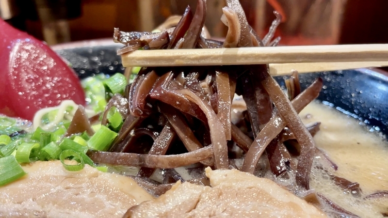 なんと言っても極細麺のクツクツした歯応えに、キクラゲのゴリゴリとした歯応えが共鳴する感覚が好き!。豚骨系ではあれば必ずやらかしてしまうキクラゲ追加!。出汁に濡れて細麺に絡みゴリゴリ弾け楽しむ歯応えが最高なのです。金出すからダブルで増してもらっても良いかと!。