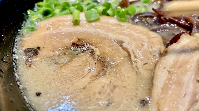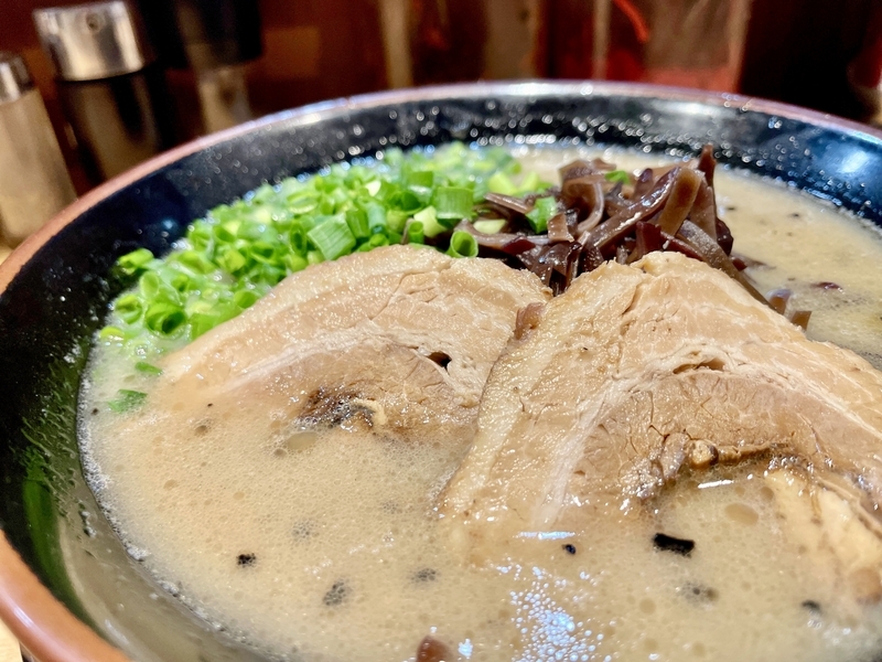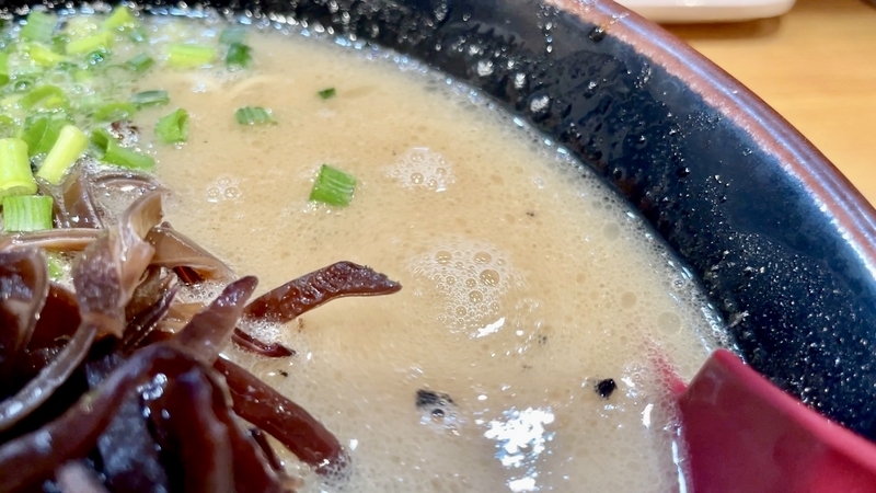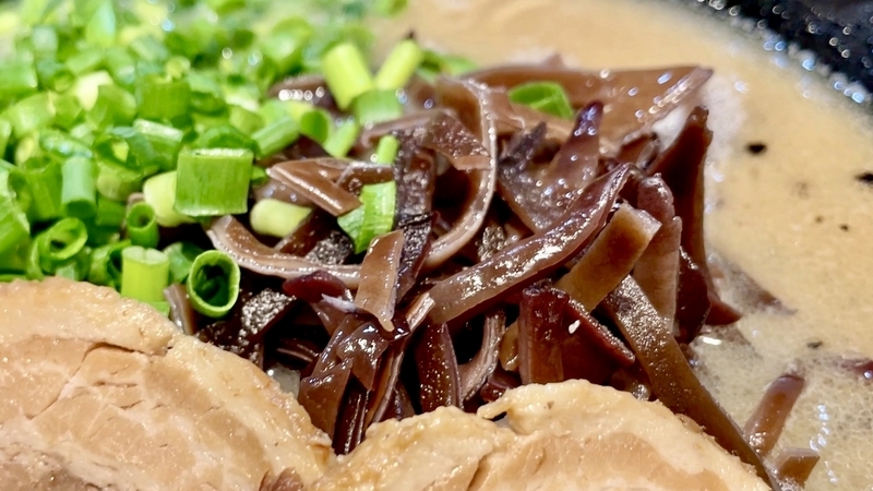 この店ではトッピングはこればっか!きくらげと青ねぎ追加。典型的な博多豚骨系のような見栄えで、すでになじみを感じる麺顔ですが、どこか優しい雰囲気がありあり。出汁感がライトな雰囲気があって、更に優しい色合いが空腹感を刺激するようです。ま、ティピカルな豚骨系という感じで目新しさはないが、質実とした雰囲気はありなむかと!。