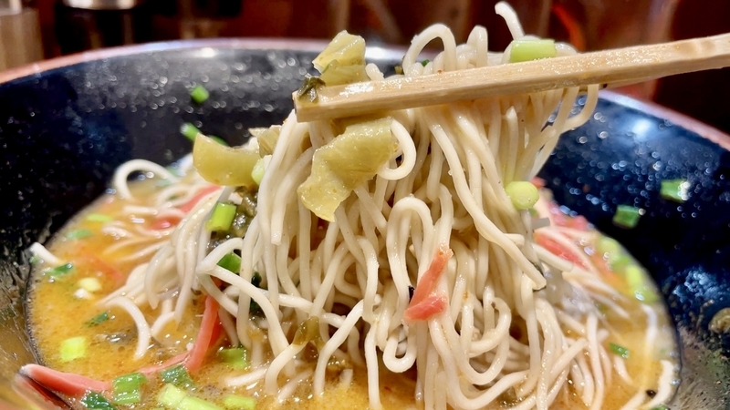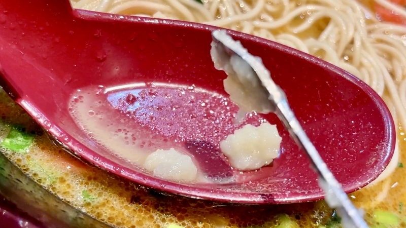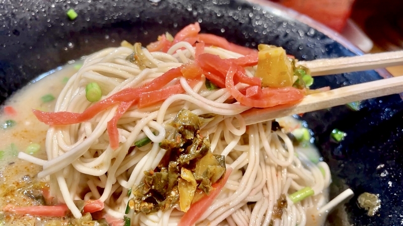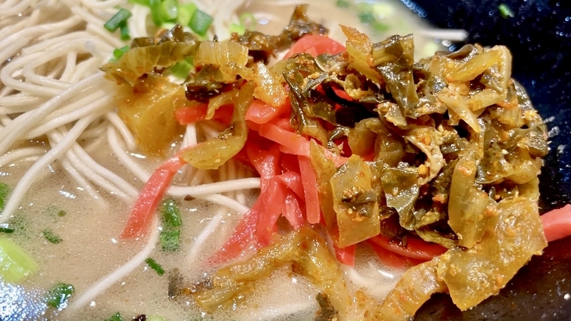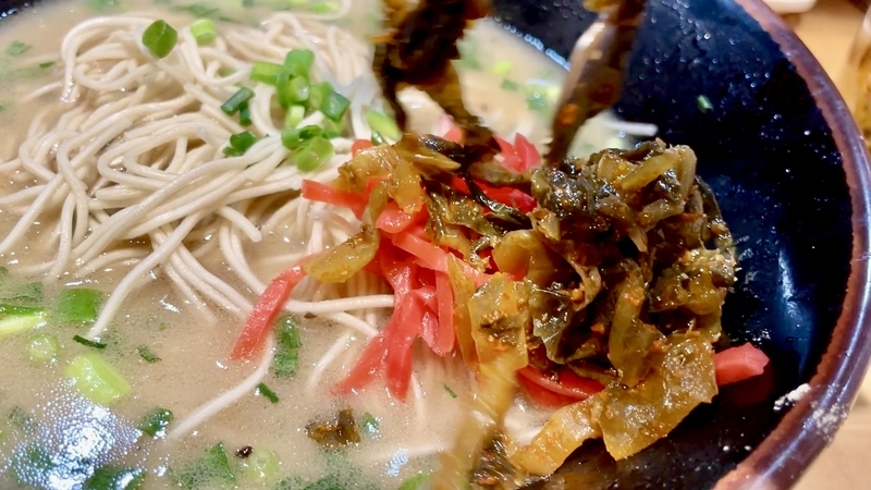 そして定番の紅生姜。ジリジリした刺激感が好きで、それだけだと金属的な刺激なんだが、豚骨出汁に浸って混じるとマイルドな刺激に変わって好きなのです。そして豚骨といえば高菜!。辛さに注意とありますが、いやいや個人的には辛さに混じる甘みがナイスで、これだけで白飯が無限大に食えそうな気分です。ちょっと入れすぎだったか・・・お店の方には少し申し訳なし。