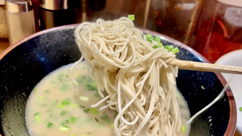 今回も当然「バリカタ」。麺のフォルムも極細ストレートの低加水系。しかし、博多系独特の密度あってパツパツとした雰囲気や抑えめな様子です。どこかこれも品やかさを感じさせ、熟成風味が低めなのが、むしろスープとのバランスが良いです。