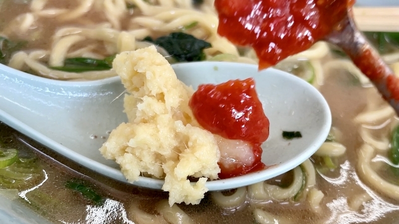 今回も「生姜メイン」。生姜をかなり多めに投入するのが好きです。テーブルセットにはないので、店主にコールして貰うスタイルです。そして「ニンニクはアシスト」「仕上げに豆板醤」という流れ。これにより豚骨醤油のベースに生姜のジリジリとした刺激が溶ける感覚です。