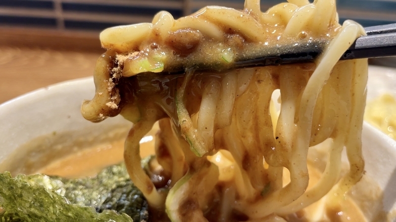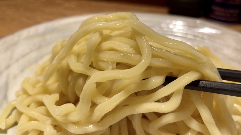 <麺> 微妙にボコつく中太麺!水切り完璧!ヌツヌツとした反発ある歯切れの後に風味あり!