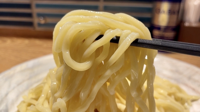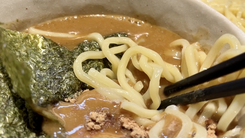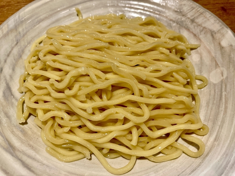 いやぁー!当たり前だが前回のらーめんよりも、引き締まりある歯応えが痛快!更にモチモチ感はハードさが増してまた秀逸です。序盤はややハードめにクッシリと感じ、閾値でプツリと弾け素地の旨味をしっかり伝えるところがナイス。更に濃厚なつけダレを徹底的に絡めて持ち上げ、つけダレ旨味を受け止めて負けない風味なのです。