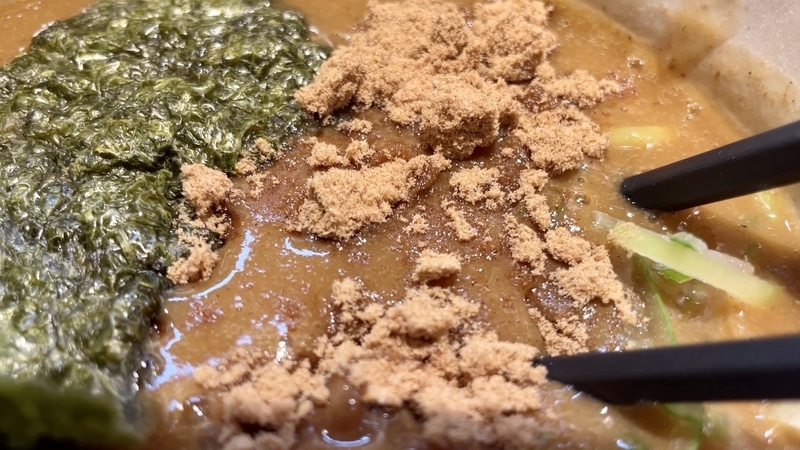 このブランド定番の濃厚鶏白湯!鶏エキスだが確かに濃密なれど、モミジ系コラーゲンのペトペト感があります。意外と重くなくてグビグビと飲み干せるようで、それはベジポタに似た印象です。汁系ではない魚粉のインパクトがあるのが特徴で、そこにカエシがしっかりと入っているため、魚介系の甘味で一辺倒にはならない工夫を感じます。