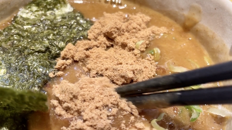 さてその魚介ですが、見た目では粉っぽさがあるかも知れませんが、ふわっとつけダレ全体に溶けて甘味が実にナチュラル。そこが妙にベジポタっぽさを連想妄想指定しまいます。更に個人的には醤油ダレ?カエシ?のニュアンスも素晴らしいと感じてます。鶏と魚介のまとめ役がカエシにもあると勝手に感じており、甘味の中の塩気・・・その奥に微かな酸味すら覚えてしまう?。このつけダレは、結構万能に思えどんな麺にも合いそうに思えてしまうほどです。