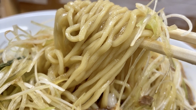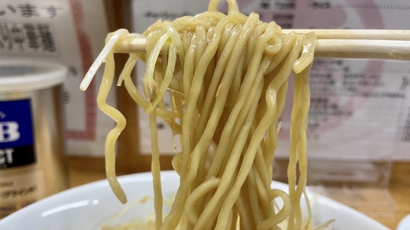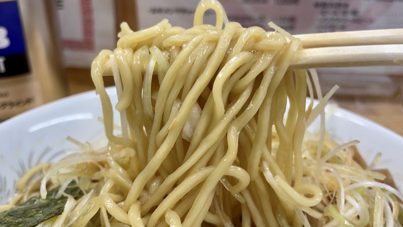 割とボコボコとした捩れたフォルムが印象的です、弱い縮れが入りつつ、それよりも捩れが強めに感じられるので、ボコボコとした啜り心地がありつつも、割と引っかかりの少ない喉越しと言うイメージ。しかも加水はやや高めな上に柔らかめの茹で上げ。さらに汁を吸い込み易い感覚ですから、物腰がとても素直でしなやかです。ズボボボーーっと勢いよく啜ると口元には若干の抵抗を感じますが、後に続くうち頬を抜けるタッチや、喉奥に感じるシルエットはとても淡い。