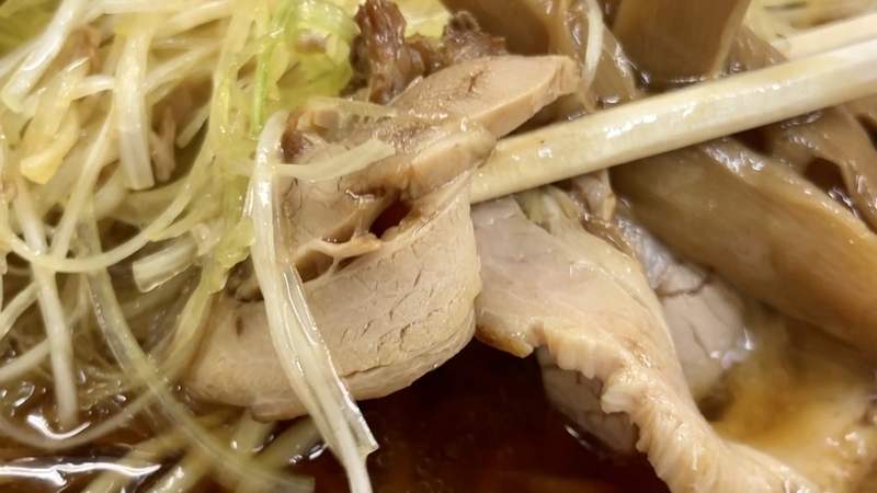 薄いスライスがいい感じ。昭和のラーメンもこんなイメージでしょうか。デフォルトでワンコイン未満で提供しているトッピングとしては上出来と言えましょう。大判になるようにロールした肉を薄切りにしています。