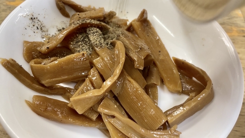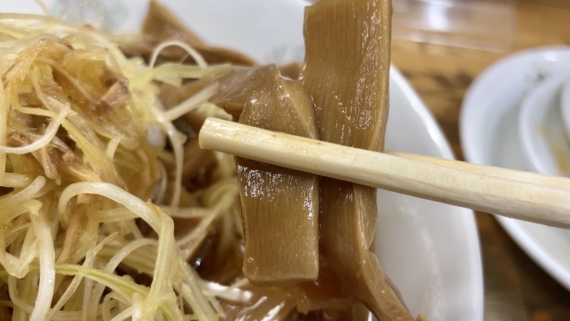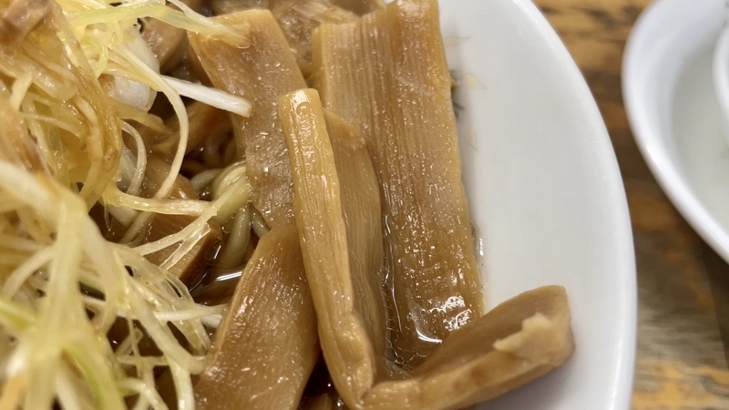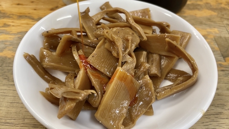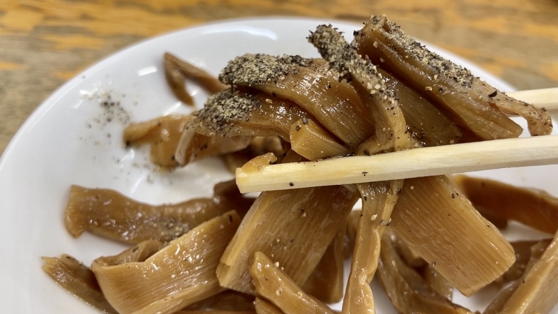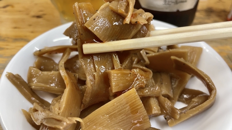 さてこのメンマ。醤油色がしっかりと染まった色合いで、その深さとは違い塩気が低くて逆に甘味あるほどに円やか。そこに少し胡椒が効かせてあり、仄かな刺激がナイスなのです。