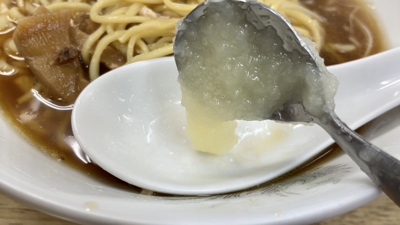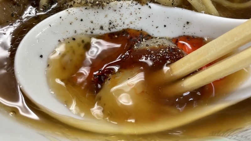 また全体的に醤油感ある見栄えですが、塩気はほとんどありません。むしろ滲みた出汁の円やかさが印象的で、スープに浸っているとその味わいと交換して吸い込む様子。グッと穏やかに味わいにもなるし、温かみも増すので、全体的にさらに優しい味わいに昇華します。