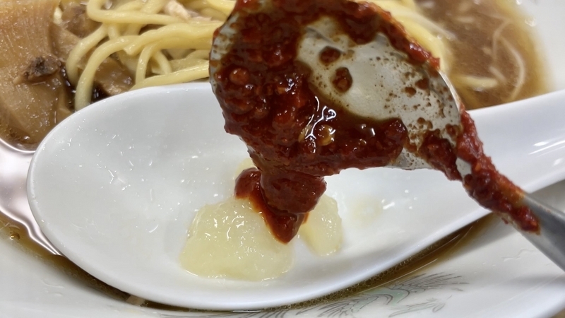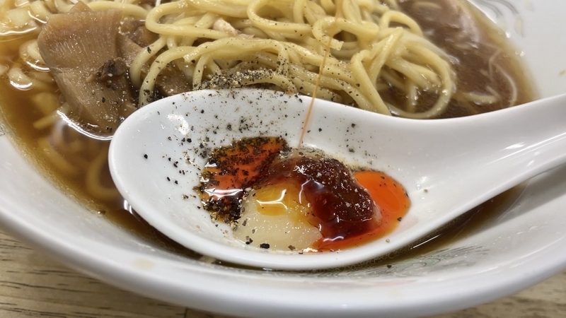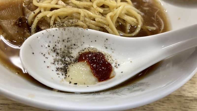素朴で質実な出汁感のまま〆ても良かったんですが、酒が入ってる感覚だったので少し刺激が欲しくなる。そいういう流れで、備え付けのおろしニンニクと豆板醤を少し溶かしてみました。ふふふ・・・これが思いの外、コクを深めてカエシのエッジングと高めるじゃないか!。更に今回はブラックペッパーを投入!後半にこそオススメ。酒と合わせるなら尚更オススメ!。
