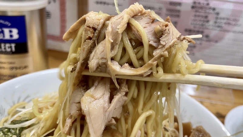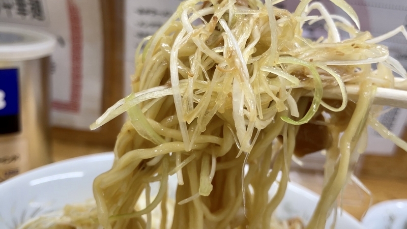 やっぱりネギ山を見たら興奮!。たぶんチャーシューのタレの割と優しい味付けが混じるようで、少しだけしんなりとした仕上がり。味付けして少し間を置いているのかもしれません。塩気や調味料、旨味油がとてもしっかりと伝わる!。