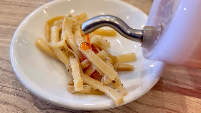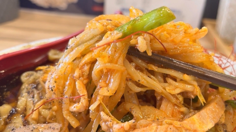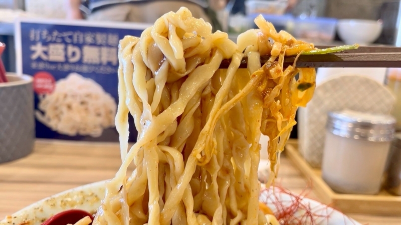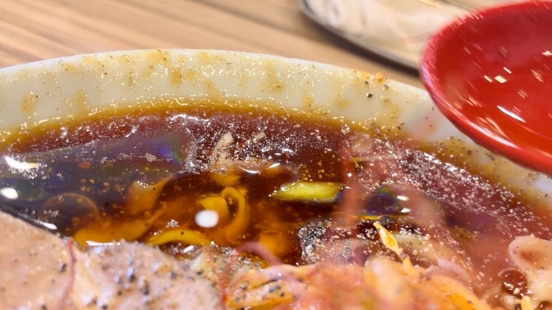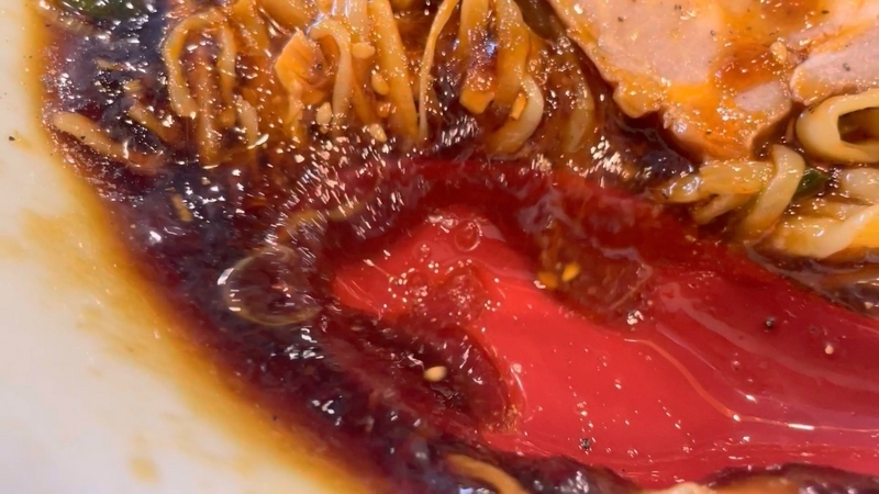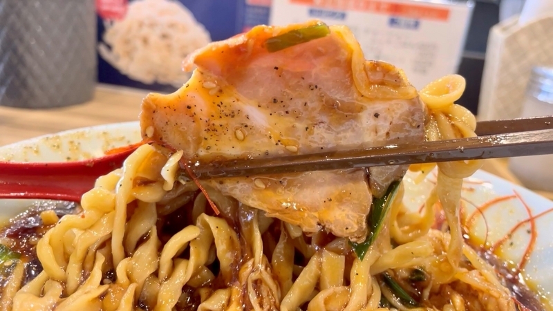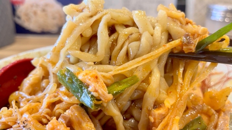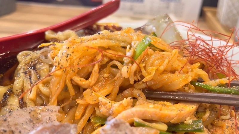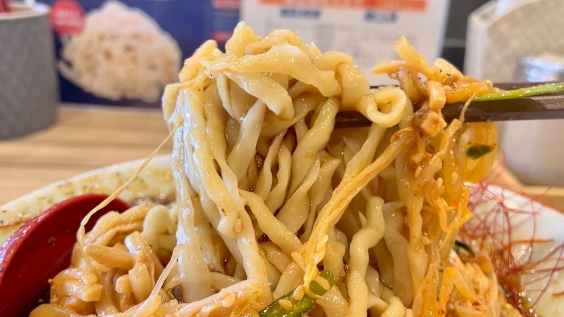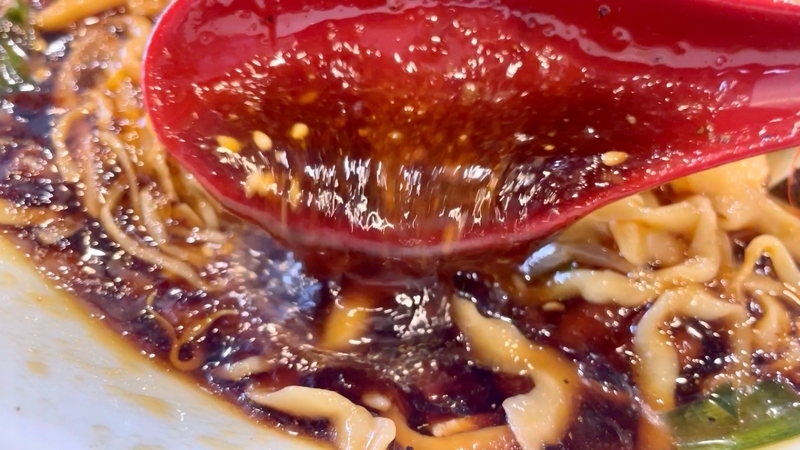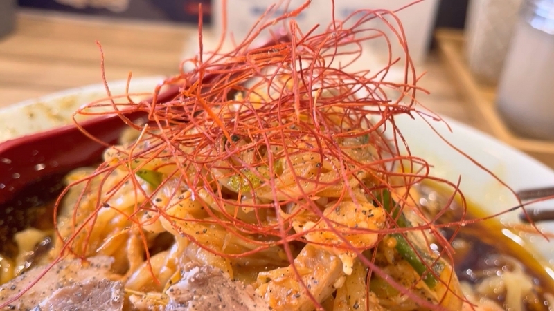 そして糸唐辛子は刺激感を高めてくれる感覚です。細いので、麺のピロピロの隙間にうまく入り込み、麺のヌチヌチ歯応えに柔らかくて淡い具材の歯応えが混じり合うのも楽しい食感。実によくできたトッピング。ガッツリスタミナ感を高めますよ。