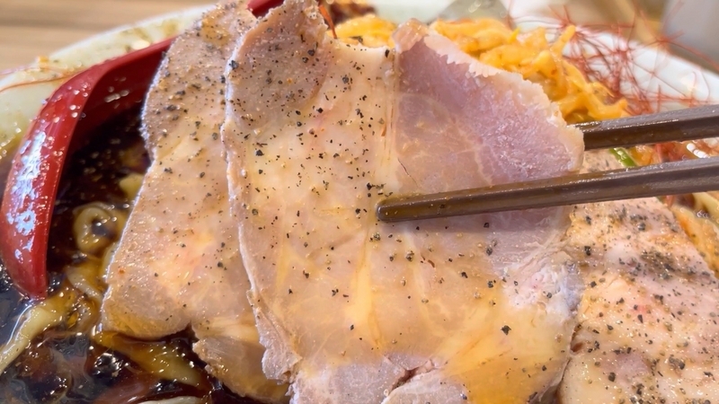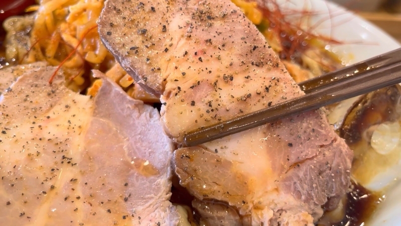 <チャーシュー> ペッパー刺激と脂身の甘みが溶け合う!豚肩ロースは赤身肉味に冷え冷え醤油餡絡む旨さ!