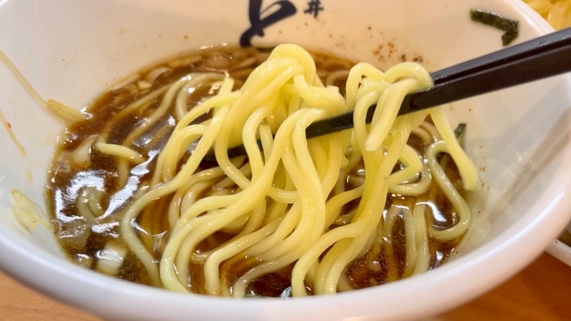 さてその麺ですが、黄色い地肌に明るい艶!モチモチ食感が楽しいストレート多加水麺!。丸長イメージなのですが、スリムな印象でつけダレとの絡みがとても良いです。多加水麺のつけ麺なので、出汁が浸透すると言うより濡れると言う感覚。それでもタレの持ち上げが良いのか、よくタレに絡みつき持ち上がります。