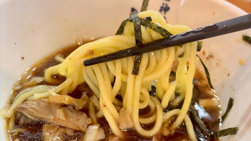 まぁ丸長丸長と言わず、素直に味わいますが、やっぱり味わいとしてはノスタルジックなイメージ。ベースの豚の煮だしがあるものの、節系を中心としつつも煮干の甘味が効いた魚介系の円やかさが広がります。仄かに一味がふられており、溶けて淡くチリっと感じさせる辛味のエッジングがいいね。