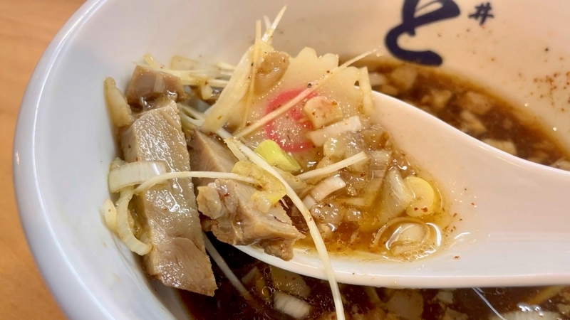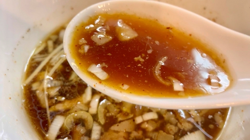 まぁ当たり前の様だが、ベースの出汁を加えると全体が淡くなる一方で、熱によって豚と魚介と醤油のパワーが復活し、生き生きと楽しめる味わいに変貌を遂げます。この感覚なら汁系のらーめんにも激しく期待を寄せてしまいます。