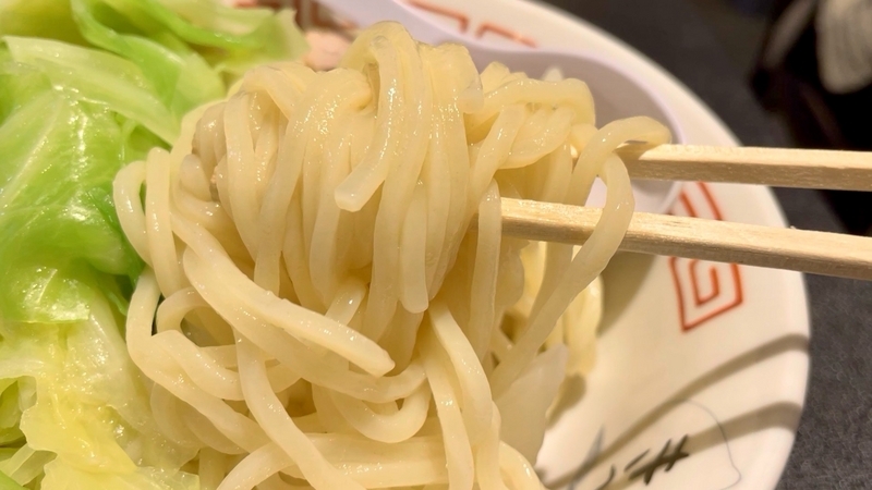 そしてモチモチ度合いがすごい。まさに弾む。更に縦伸びする弾力感です。例えば麺を箸で引きずり出そうとすると、ずるずると引っ張れそうなものだが、この麺の場合はまるでゴムのようにずるずるとズレず、上の麺が重しとなってズレようとしない。そのまま引くとゴムのようにビヨーンと縦に伸びるようなのだった:汗。