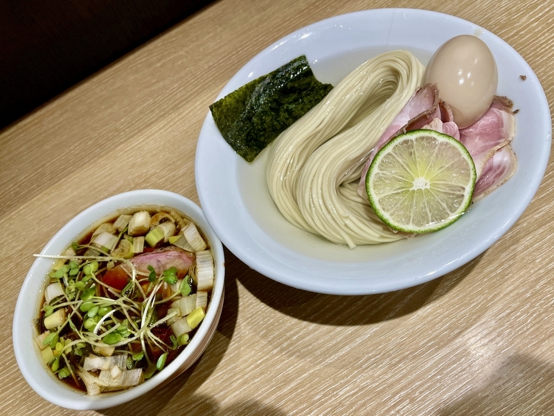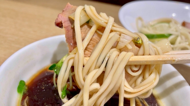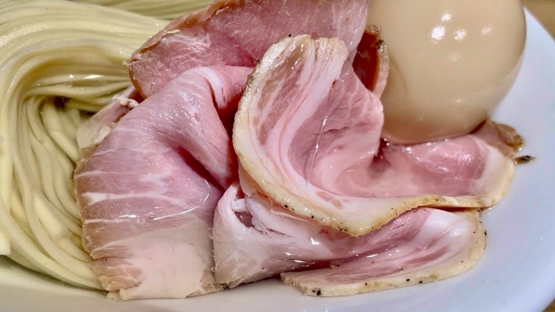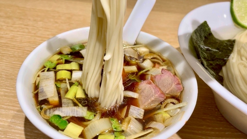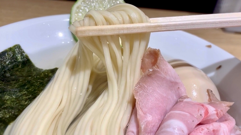 ここは麺のバリエーションが素晴らしい。汁系とつけ麺、そして汁なし系で自家製麺を使い分けていて、しかもそれがどれも完成度が高いのです。中でもつけ麺用の麺は、少しグラマスな中太麺で低加水系。腰と風味の強さがウリです。昆布水に浸って、それはまるでトリートメントを施したかのような纏まりが感じられます。形状は感覚的にはパスタで言うリングイネに少し似てるかも。これも麺に力強さに関連するようです。