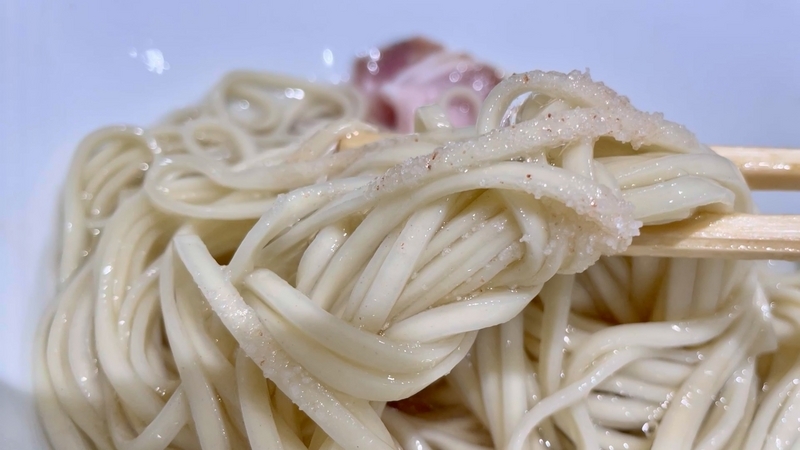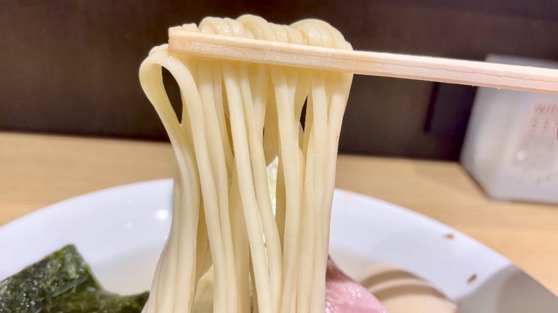 <麺> 素地の力強い風味!スリムなリングイネの如し中太ストレート低加水麺!昆布水と絡み旨さアピール!
