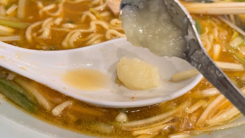 ルーティーンのように味変化。朝に訪問だったがニンニクポットがほとんど空で、スタフさんを呼ぼうかと思ったんだけど、何とか1回分はあるようだったのでかき集めてレンゲに垂らします。続いて豆板醤を垂らし、レンゲの中で出汁で軽く溶いてから出汁に沈めて撹拌。更に最近味変化アイテムとして追加された「一味」を入れてトリプル味変化でございます。軽くレンゲの中で出汁で軽く溶いてから出汁に沈めて撹拌。終盤にパンチ力発揮!