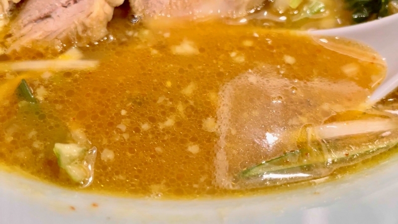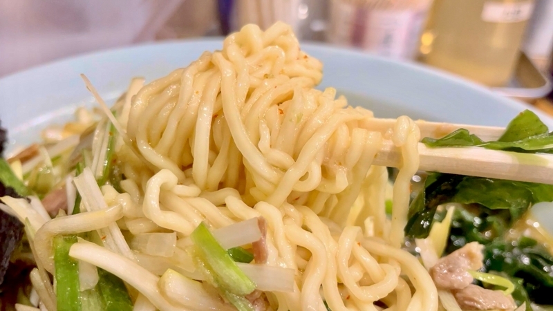 イメージ的にはマイルドなラーショ系出汁感。期待通りの塩気の輪郭とやや野趣と感じ取れるような豚骨煮出し。マイルドな雰囲気もあってナイス。そんな気分で多少勢いよく飲むと後追いで青唐辛子の刺激が響く?。思わず咽せそうになります(汗)。でも刺激は爆発的でもなく、すぐ慣れてしまうかと。