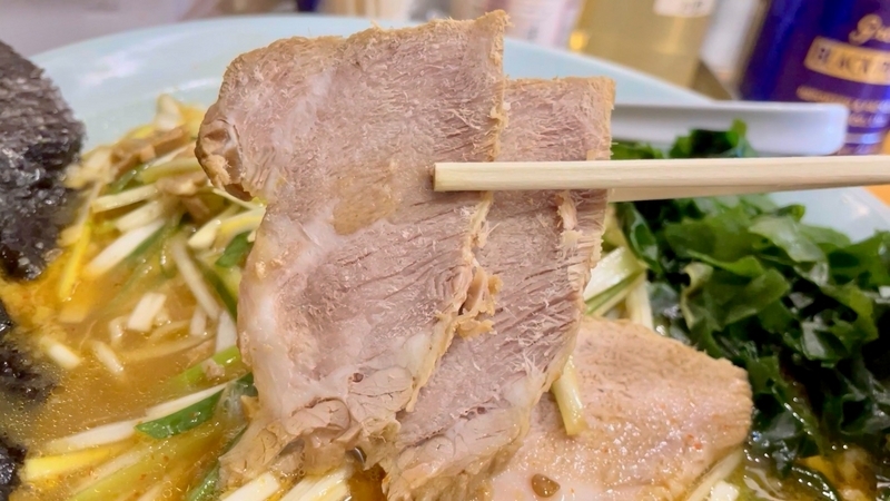 <チャーシュー> 程よく脂が抜け気味な豚肩ロース!青唐辛子豚骨醤油を吸いまくるスポンジ肉