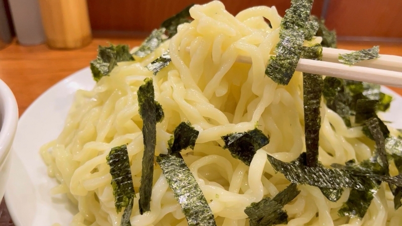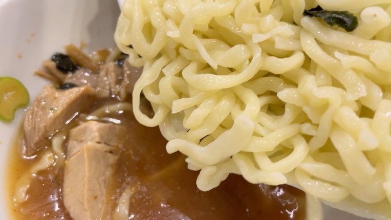 これぞ満来って感じでいかにも多加水な捩れた太麺。ボコつくところが素朴にも見えて和みます。潰し込み感覚はなく、とてもライトにモチモチプツプツと明るく弾む歯切れ感覚。奥歯へ運ぶとクチリと呆気なく潰れて、淡白な甘味を発するようです。