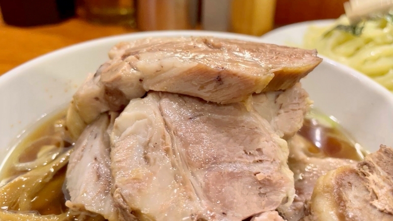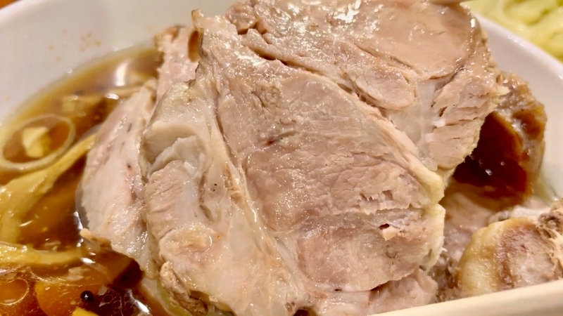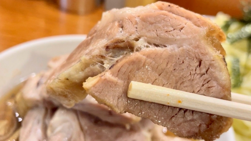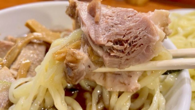 脂身が分厚くて印象的ですが、全体的にはよく煮込まれた豚肩ロースで、ぶつ切りか?と思うほど大胆な分厚めなカット。なので脂身が固まりとしてしっかりと味わえて甘味すら覚えます。赤身は煮出された感覚があって、スカスカっとした仕上がり。スポンジのように出汁を吸った赤身と、程よく抜けた脂身の甘味を合わせて食らうのが超旨し!。