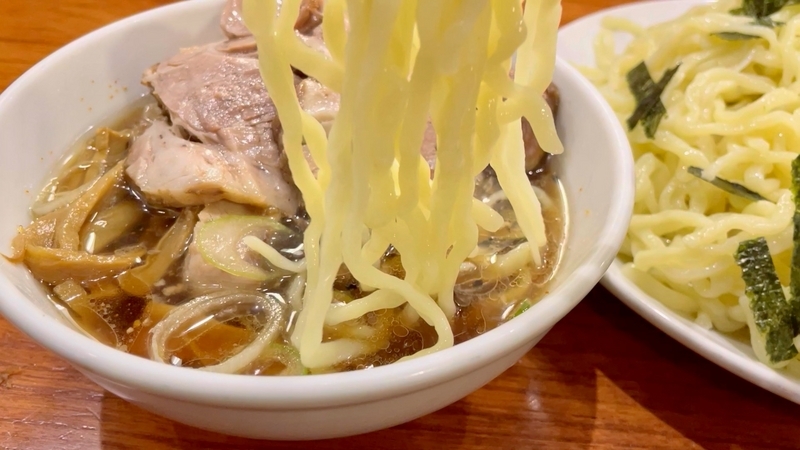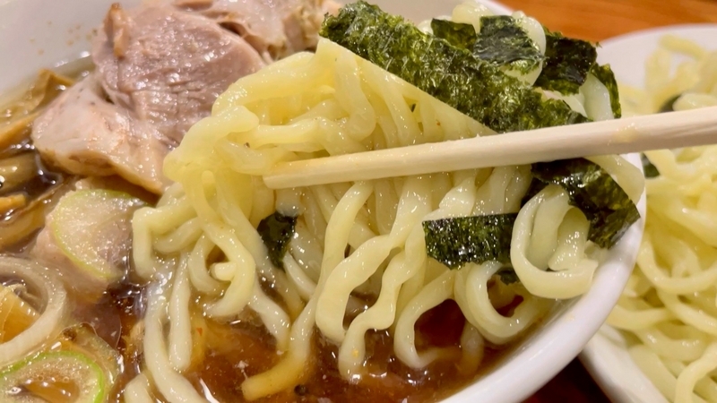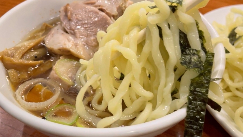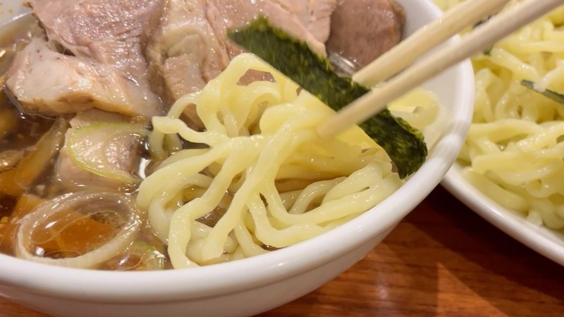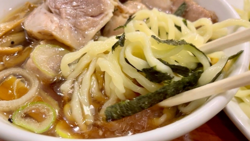 ライトな醤油ブラウン!円やかこの上ない醤油清湯が素晴らしい!。優しい豚エキスの感覚ですが全く重く感じません。醤油明るく映えますが、塩気と言うより甘味が浸透するような感覚。主体は豚系と思われる優しい煮出し感ですまさしくゴクゴク飲み干せる感覚で、女性比率も高いかと。また少し一味が溶けてるのも一興で、よくよく味わえば昆布の穏やかさもあるような優しさ??。
