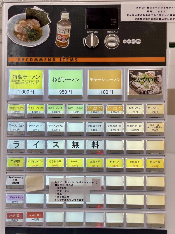 さて訪問してびっくり!ここ本当に開店して10年以上経った店か?。改装したのかもしれんが。それにしてもとにかく店箱の隅々までキレイ!。換気扇フードの隅までも磨かれたようではないか。こんな気持ち良い本格的家系なお店は初めてかも。そして家系らしい威勢よい出迎え挨拶もよく、接客の言葉や態度、オペレーションまでもが気持ち良いではないか・・・。