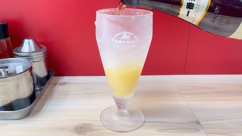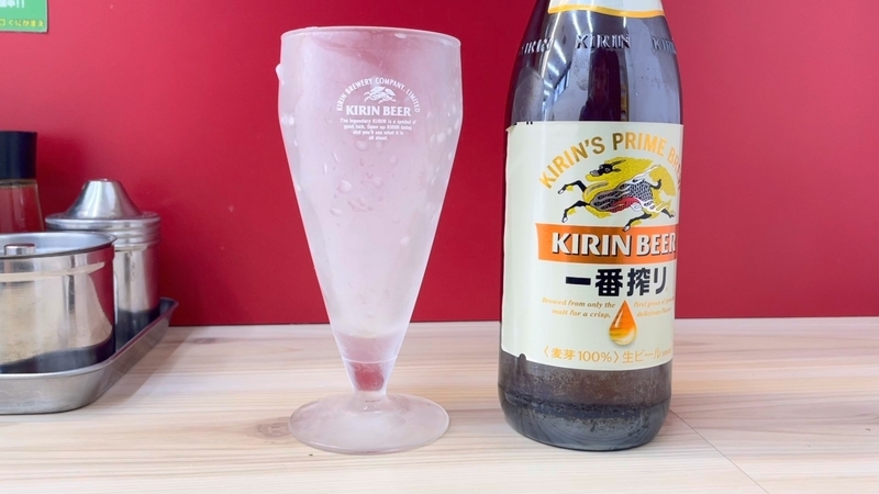 券売機の瓶ビールボタンは500円表示。これが結構読めないパターンで、店に小瓶だったりする。まぁ飲むき満々だったし押さない手はないんだが、中瓶が出てきてほっといたします。しかしそれだけでなくグラスがナイス!。洗った直後に冷凍庫に保管したのか、雫がそのまま貼り付くほどグラス全体が凍りついておるではないか!。しかもキリンオリジナルグラス。