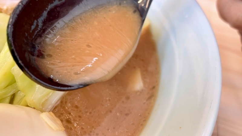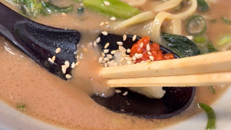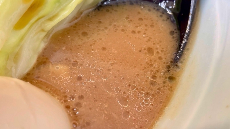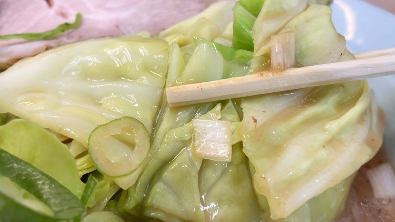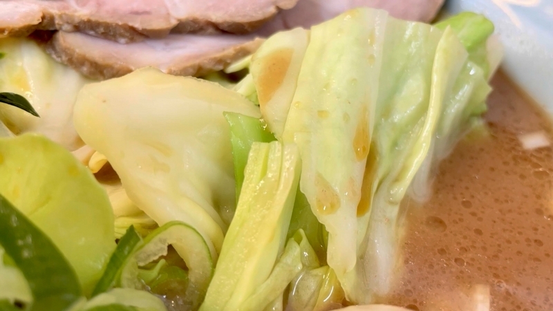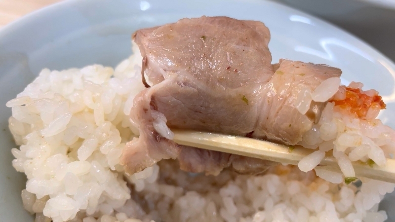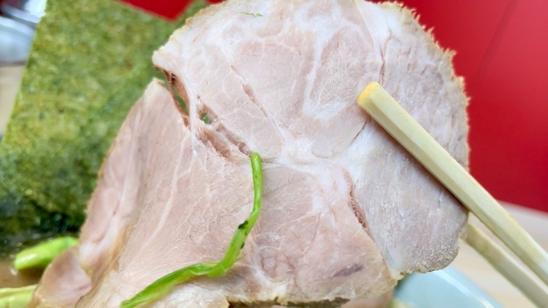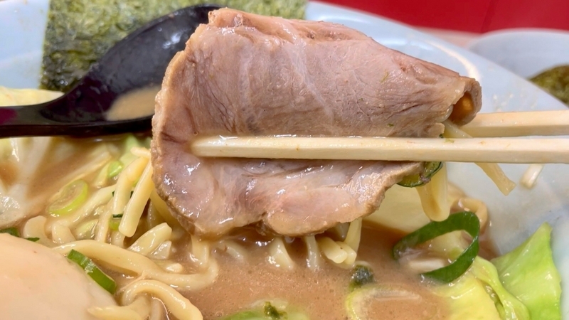 部位は多分肩ロース。赤身には細かくメッシュが入るかのように脂がさしており、周囲には醤油ダレが染みたよな色変化があります。大判でスライス厚めが2枚。なのでひと口で食べるのに無理っぽさを感じるほど量感ありです。少し引き締まったような肉質ですが、歯応え柔らかめ。少し出汁を吸い込むようで、沈めて少し放置すると隙間に豚骨醤油が入り込み、スポンジのように吸い込んだ後で噛み締めて旨さ吐き出すってな感じで楽しめましょう。